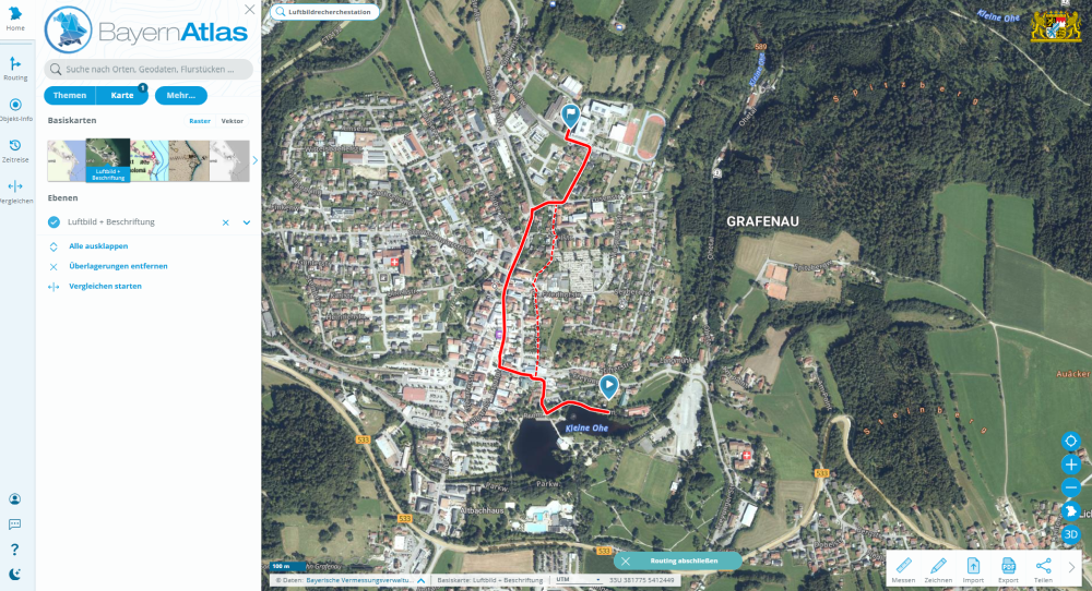 - Routing öffnen: Per Klick in die Karte den Start- und Zielpunkt festlegen und die Route wird generiert.