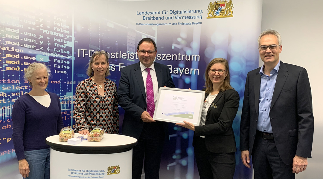 v.l.n.r.: Gen Cory (ADFC-Auditorin), Petra Husemann-Roew (Landesgeschäftsführerin ADFC Bayern), Finanz- und Heimatstaatssekretär Martin Schöffel, Eva Mahling (Landesvorsitzende ADFC Bayern), Martin Stegmeier (Leiter IT-DLZ)