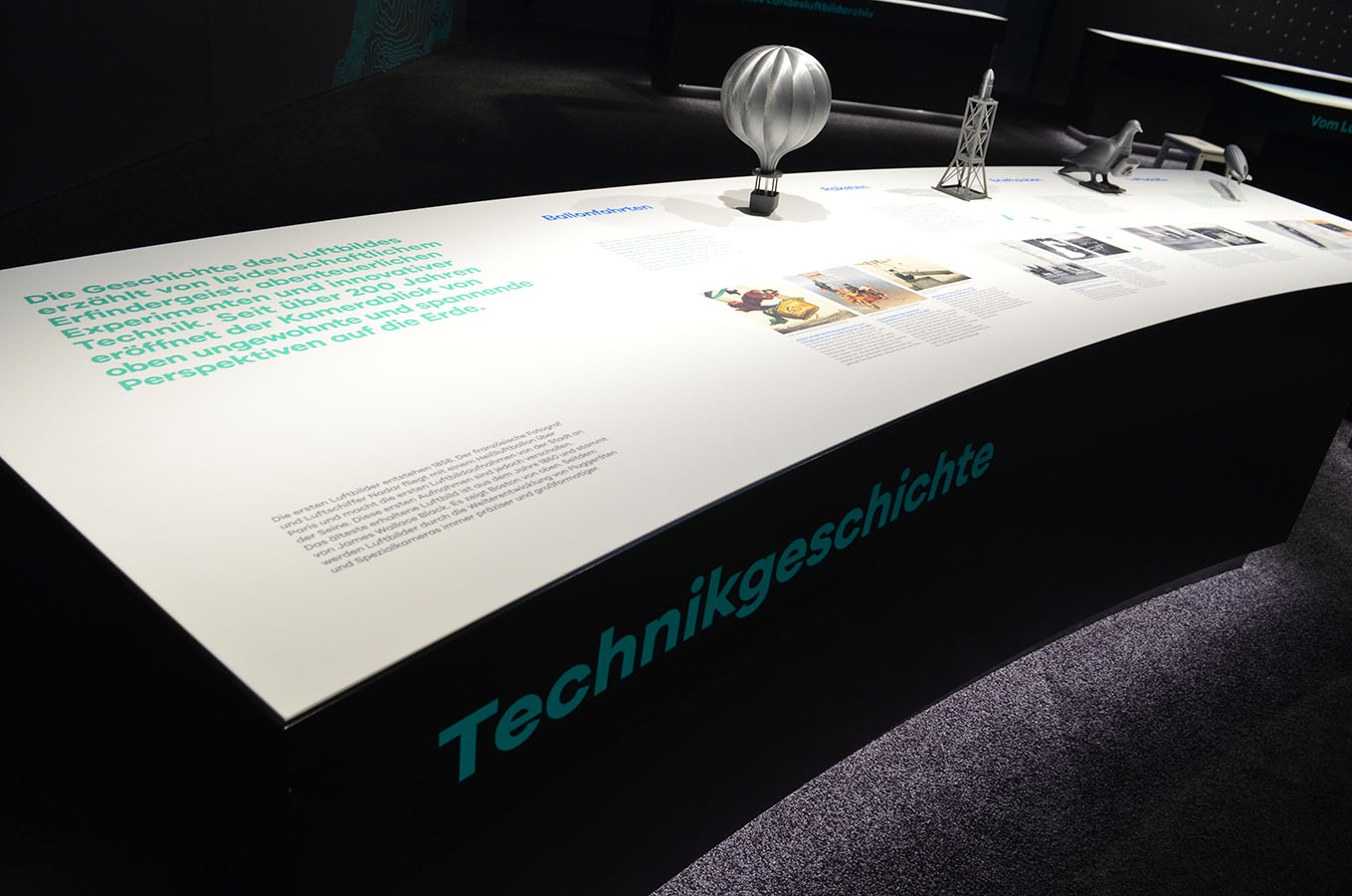 An der Recherchestation können Luftbilder aus ganz Bayern aufgerufen werden. Dabei werden Veränderungen von Landschaften und Städten gut sichtbar. Ein virtueller Flug über die Zugspitze, der Blick durch eine Anaglyphenbrille oder durch ein Stereoskop machen deutlich, wie Gebäude und Landschaften in Luftbildern zu dreidimensionalen Objekten werden.